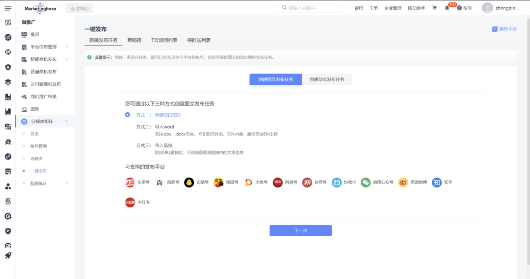 T云可以帮助制造业企业实现自媒体矩阵营销,可覆盖如微信公众号、小红书、头条号、知乎、bilibili、百家号、搜狐号等十多个平台。每个平台都有其独特的用户群体和特色,通过矩阵布局,企业可以全方位覆盖潜在用户,提高品牌曝光率。
