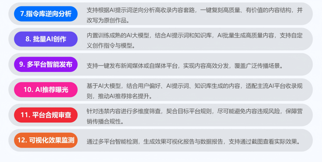 【行动】:AI批量创作权威原创、高信息浓度的内容,精准匹配目标用户需求与行业核心议题,强化内容和AI检索的适配性。