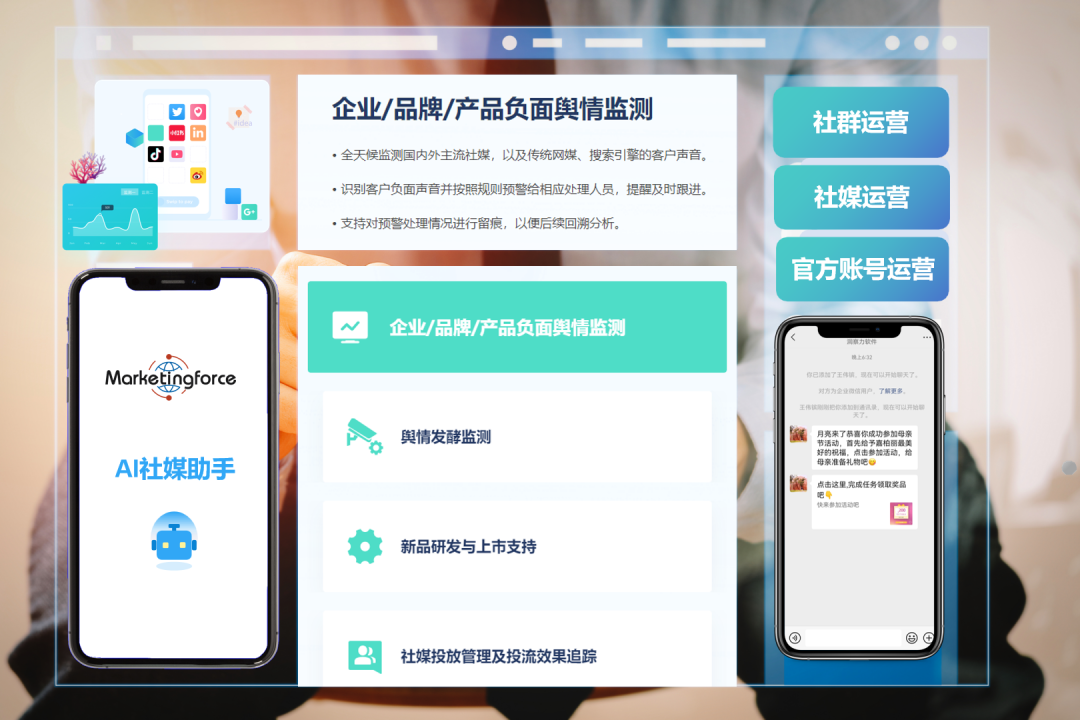 渠道运营&转化:在企业追求数智化转型的过程中,Marketingforce提供智能化的品牌展示和销售管理解决方案。我们深入理解各个媒体平台的特性,根据用户需求优化内容展示,确保品牌信息在正确的渠道以最佳形式呈现,从而提高运营效率和销售转化率。