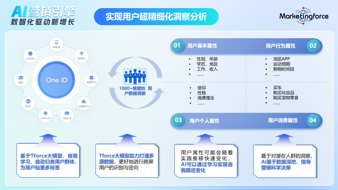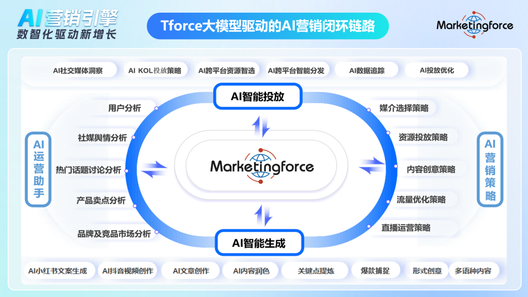因此,Marketingforce以企业使用场景为核心,通过生成式AI技术为品牌提供全链路营销赋能,显得尤为重要。我们的服务从内容创造到客户分析,覆盖了营销的每一个关键环节,确保品牌能够以更精准、更高效的方式与消费者互动。